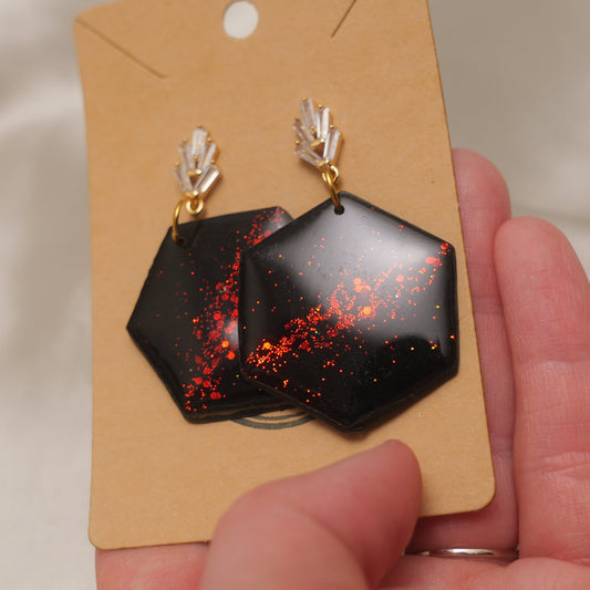 Black Shimmery Dangle Earrings with Flower Rhinestones and Gold Detail
