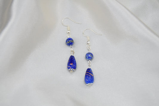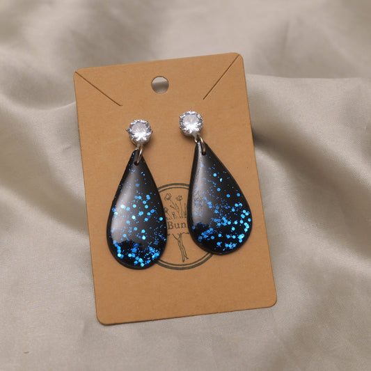 Black with Blue Glitter and Zirconia Teardrop Dangle Earrings